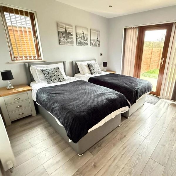 A patio door opens directly onto the garden, giving the room a bright and airy feel while providing effortless access to the hot tub—perfect for relaxing mornings or peaceful evenings outdoors.