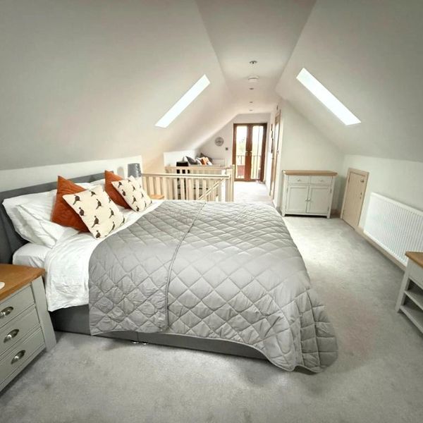The room also boasts a striking vaulted ceiling, enhanced by Velux roof lights that bathe the space in natural daylight and provide a beautiful view of the night sky after dark.