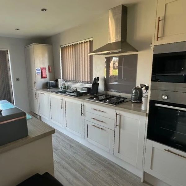 Step into a bright and modern open‑plan kitchen designed to make your stay both comfortable and convenient. A single electric oven is paired with a 4‑burner gas hob, giving you everything you need for anything from simple breakfasts to family‑style dinners.