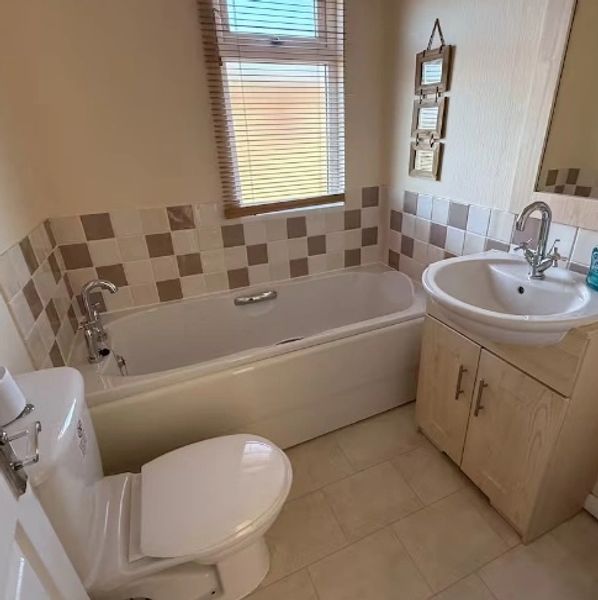 This practical and well‑presented bathroom offers everything you need for a comfortable stay. It features a bath with decorative tiling above, adding a touch of style while providing the perfect place for a relaxing soak. The room also includes a toilet and a sink with a vanity cupboard, offering handy storage space for your toiletries. A large mirror above the sink helps brighten the room and makes getting ready each day both easy and convenient.