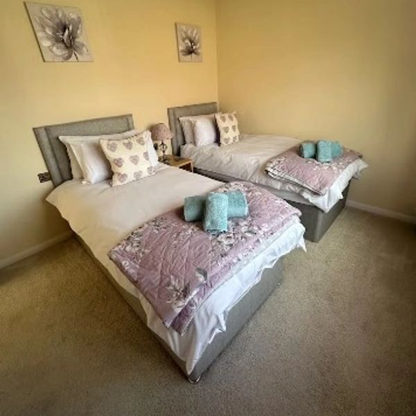 The second bedroom offers a bright and comfortable space perfect for children, friends, or additional family members. It features two single beds, each thoughtfully positioned for privacy and comfort, making it an ideal place to unwind at the end of the day. Between the beds are two bedside cabinets, each fitted with a soft bedside lamp, providing gentle lighting for reading or relaxing in the evenings.