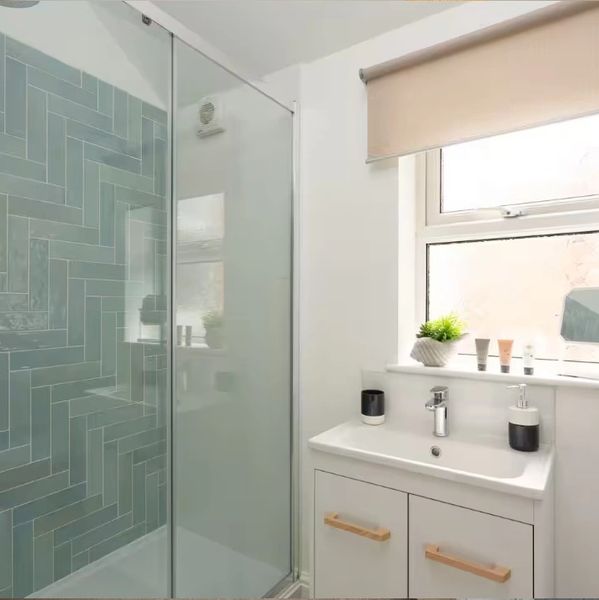 Step into a clean, contemporary bathroom designed with comfort and convenience in mind. The centrepiece is a sleek shower cubicle with clear glass panels, offering a refreshing space to start or end your day. Bright tiles and modern fixtures give the room a crisp, airy feel, while soft lighting adds a touch of warmth.