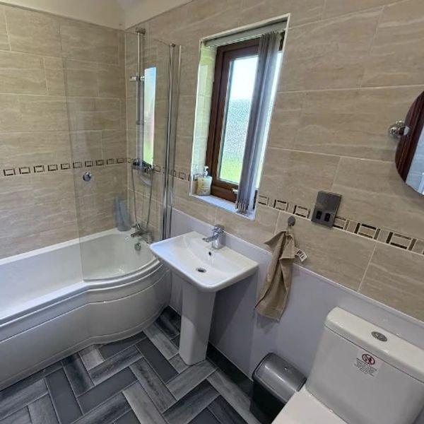 This compact yet well‑designed bathroom provides all the essentials for a comfortable stay. It features a bath with an overhead shower, complemented by decorative tiling that adds a stylish touch to the space. A toilet and sink complete the room, offering everything guests need for a refreshing start or a relaxing end to the day.
