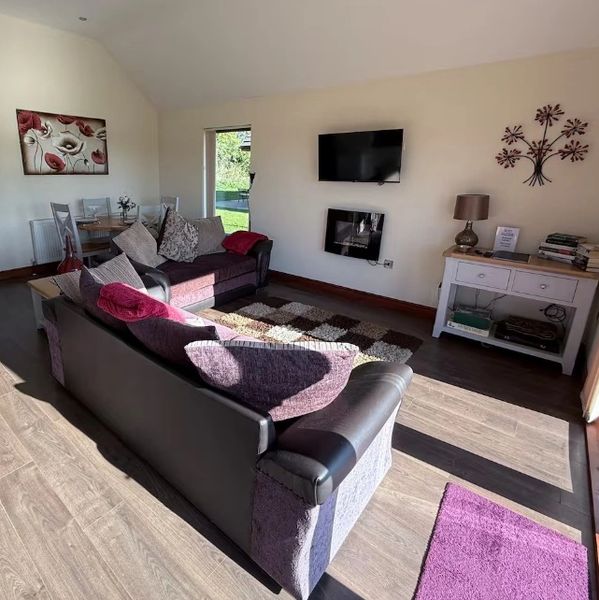 Step into a stylish and comfortable open‑plan living area designed with relaxation in mind. At its heart, you’ll find elegant sofas seating up to four guests, creating a welcoming space to unwind after a day of exploring. A coffee table sits to the side, perfect for drinks or snacks. For cosy evenings in, enjoy the warm ambience of the stylish electric fire, adding a comforting glow to the room. Soft lighting from the standard lamp enhances the relaxed atmosphere, making it ideal for reading or settling in for a quiet night. Entertainment is taken care of with a Smart TV, offering access to your favourite streaming apps and shows.