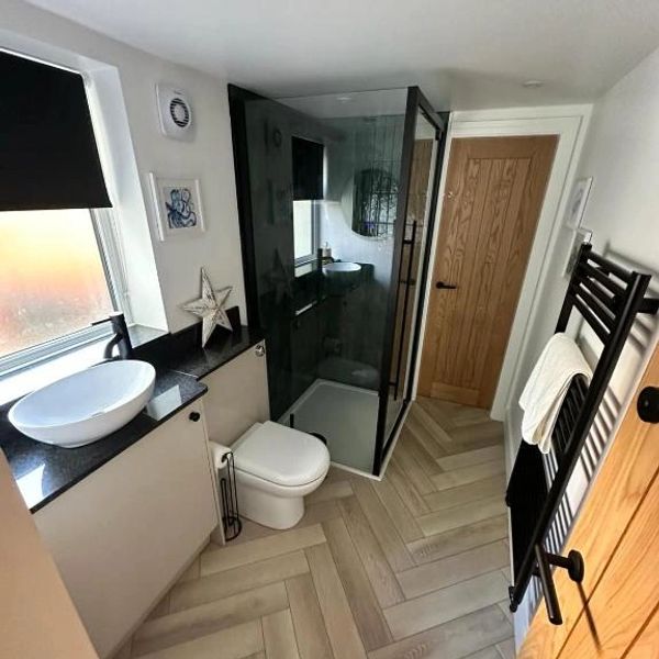 A modern basin and a standard WC complete the room, while fresh towels are provided for your convenience. Practical and well-presented, this bathroom offers everything you need for a relaxing stay.
