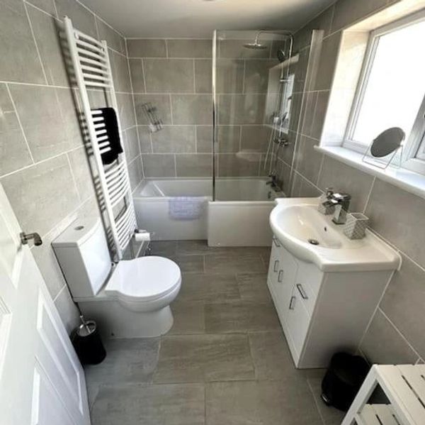 Step into a sleek and stylish bathroom designed for comfort and convenience. It features an over-bath shower, perfect for refreshing or relaxing after a day of exploring. The room also includes a contemporary sink, toilet, heated towel rail, and premium finishes throughout.